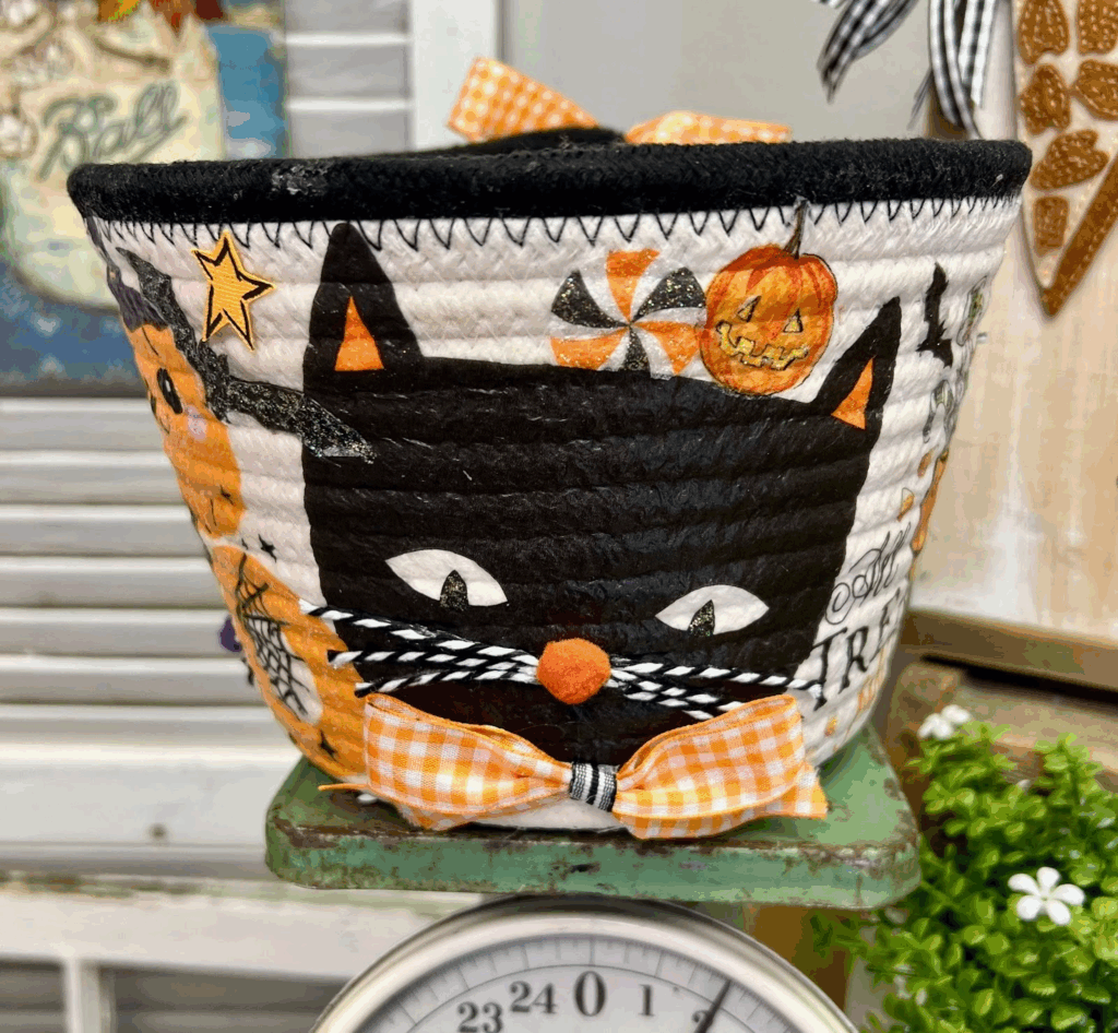Keep working your way around the basket, applying napkins wherever you want a pop of Halloween cheer. Be sure to let one section dry before overlapping another, especially if your designs are close together. Use a mix of larger focal napkins and smaller supporting elements to balance your design. Add a black cat to one side, a “Happy Halloween” phrase to the front, and maybe even some little pumpkins or candy cutouts to fill in any empty spaces. The cotton rope will give your designs a wonderful texture that looks handmade