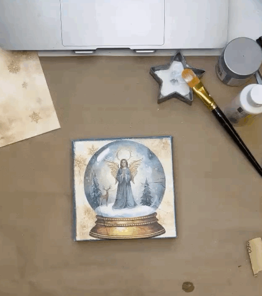 When the napkin layer is dry, sand all four sides of the canvas with downward strokes. This removes the excess napkin and creates perfect decoupage edges. Lightly distress the corners if you’d like – the white canvas peeking through adds a vintage snowy feel that fits perfectly with a nativity snow globe design.