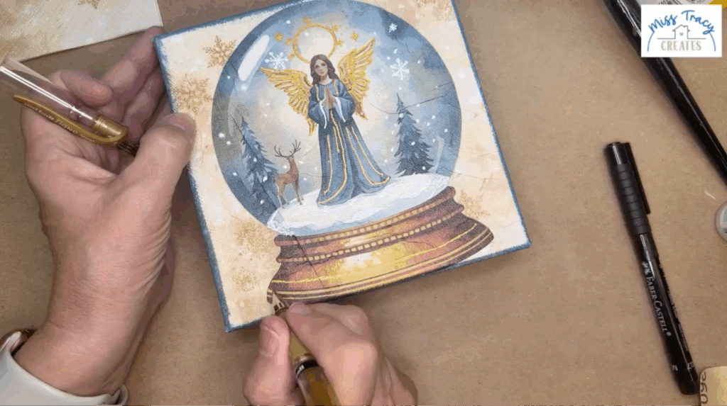 Apply Stickles glitter glue anywhere you want the canvas to shimmer. Add it to the halo, stars, snowflakes, robe, and glass-like highlights of the snow globe. In the snowdrift area, add Stickles only between the white pen lines – this creates a layered, dimensional effect that looks magical under holiday lights.