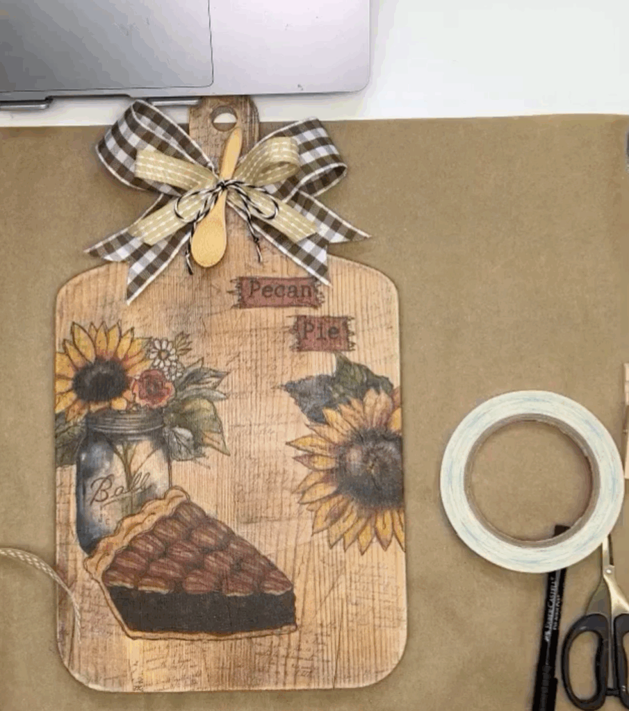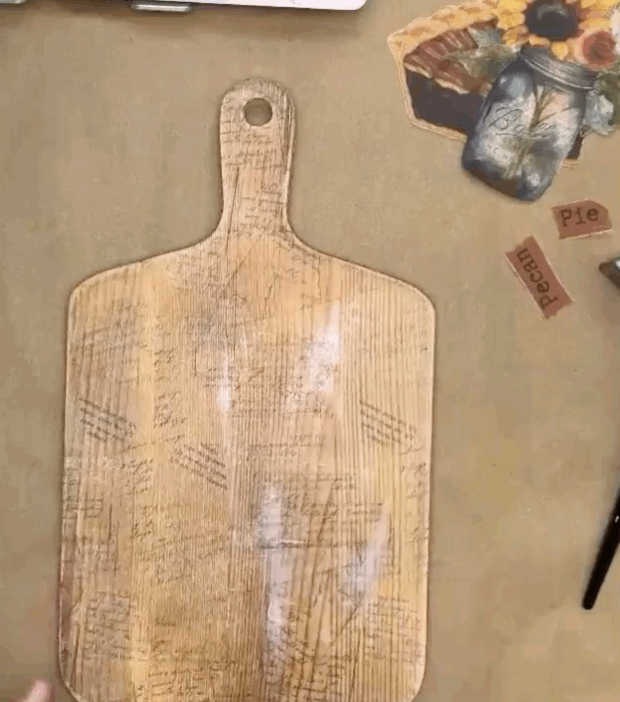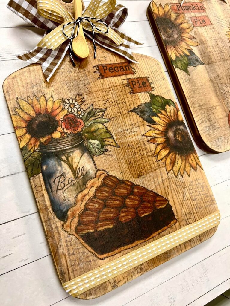 Your finished Fall Cutting Board is a beautiful blend of cozy charm and handmade detail. Between the layered recipe cards, the sunny florals, and the slice of pie, it captures everything we love about the season. Each one will turn out a little differently depending on your chosen napkins and layout, making it uniquely yours.
