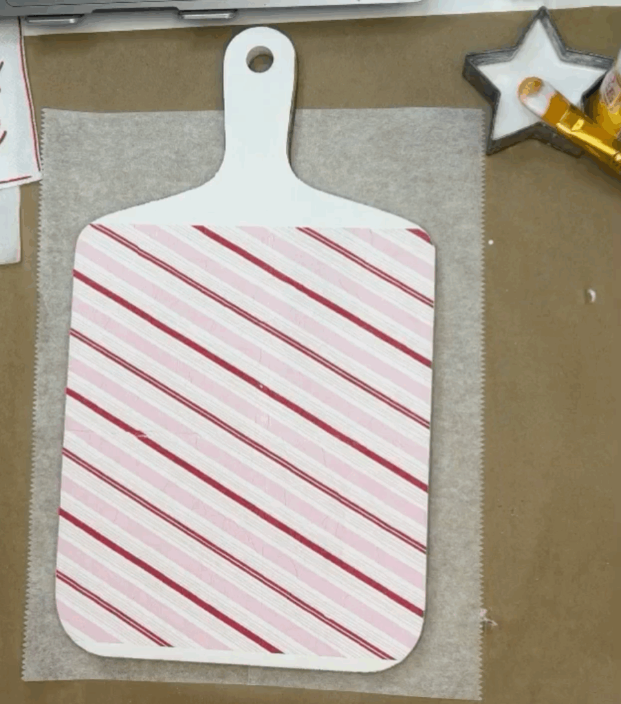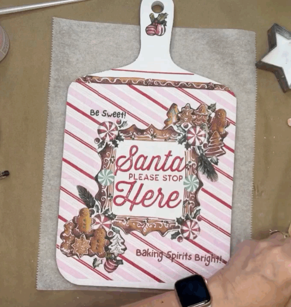 You’ll start Mod Podging with the largest napkin pieces first, typically the gingerbread and candy background napkin. Apply a generous coat of Mod Podge Matte directly onto your cutting board using a brush. Be sure to cover the surface evenly, but don’t overwork it. Place your napkin carefully onto the wet Mod Podge, then smooth it out gently using a sheet of plastic deli wrap. Start at the center and move outward to push out any air bubbles or wrinkles.