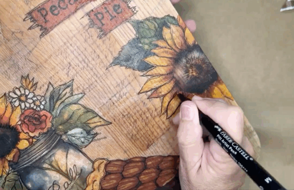 When your board is fully dry, it’s time for one of my favorite techniques: pen work. Using Faber-Castell Pitt Pens, you’ll outline and accentuate your designs to make them pop. Choose a medium tip (0.7) pen and start by outlining your sunflower, leaves, jar, and pie.