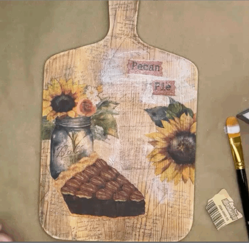 Start by applying Mod Podge to the area where your jar will go, then carefully position and smooth the napkin using a deli sheet. Once that’s dry, add your pie slice and fit it into place along the traced edge. Finish by adhering the sunflower or bouquet, allowing it to overlap slightly for a layered, dimensional look. When all of your images are applied, let the board dry fully before sealing.