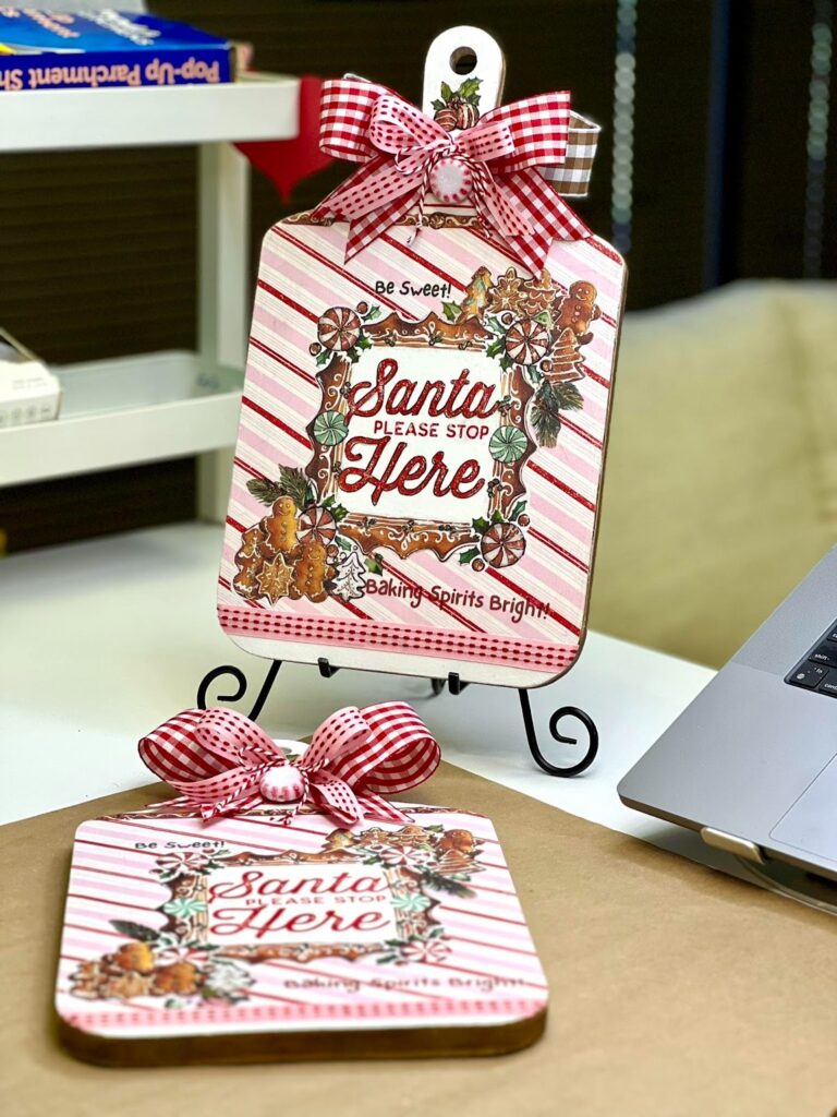 When the board is fully dry, reattach the leather hanger if you’d like to hang your piece, or display it upright on an easel or kitchen shelf. The reversible design makes it easy to rotate from fall to Christmas without storing multiple decor pieces — simply flip it over when the seasons change!