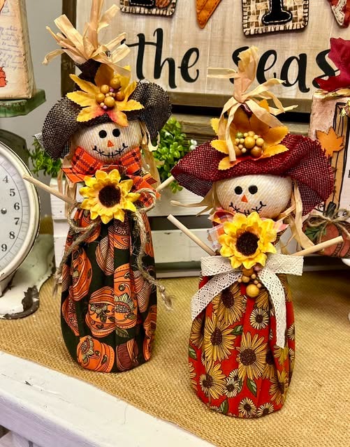Repeat the process using cones of different heights and fabric patterns to create a whole scarecrow family. Cut your cones down with scissors or a craft knife for a shorter scarecrow body. Use contrasting hats, ribbons, and embellishments to give each one their own personality. These make darling centerpieces, shelf decor, or gifts for teachers, neighbors, or Thanksgiving hosts.