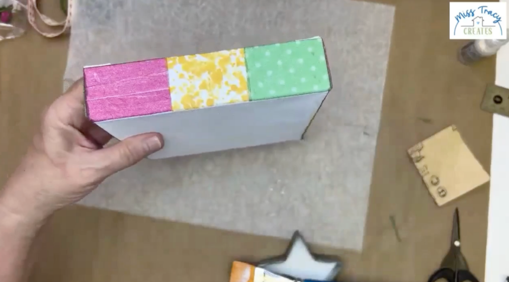 Begin by preparing the patchwork pieces that will wrap around the sides of your canvas. Cut your coordinating napkins into strips that are about 1 1/2 inches wide to match the depth of the canvas. Then cut those strips into smaller sections, about 2 inches long, so you can create a patchwork effect. Plan to use three pieces per side, mixing patterns and colors in a way that feels balanced and fun. This step is all about creating a soft, quilt-like look, so don’t worry about everything matching perfectly.